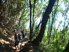 Next to the chapel lies a wooden kiosk. We continue on the earth road and, after 150 meters at a right uphill turn of the road, watching on the left side (attention!), we find the continuity of the path. It goes down through jungle-like vegetation, crosses a small stream and then opens to another earth road, on which we walk to the left. After another 100 meters, at a left downhill turn of the road (attention!) we find the path on the right and keep going downhill.